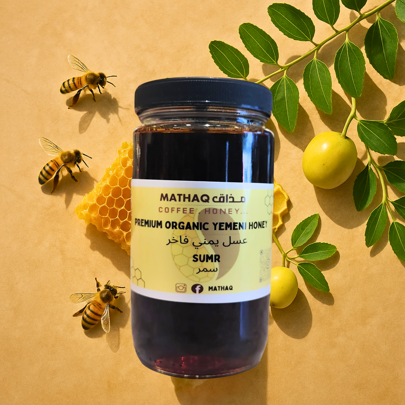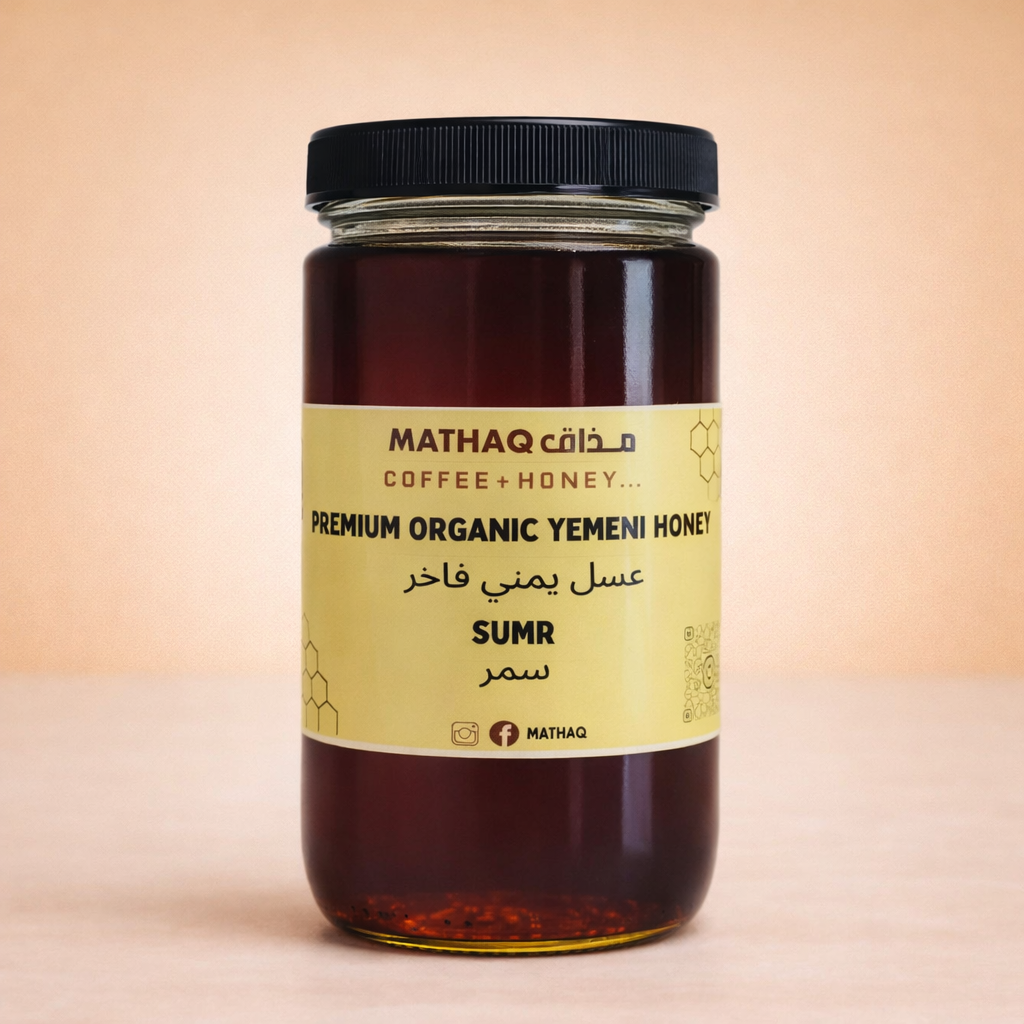 Sumr Grade A Honey (16oz) Harvested from the blossoms of the Sumr (Acacia) trees in Yemen, this honey carries a deep amber color and a smooth, slightly tangy flavor. Renowned for its natural energy-boosting properties and health benefits, it is a true delicacy from Yemen’s rich landscapes.