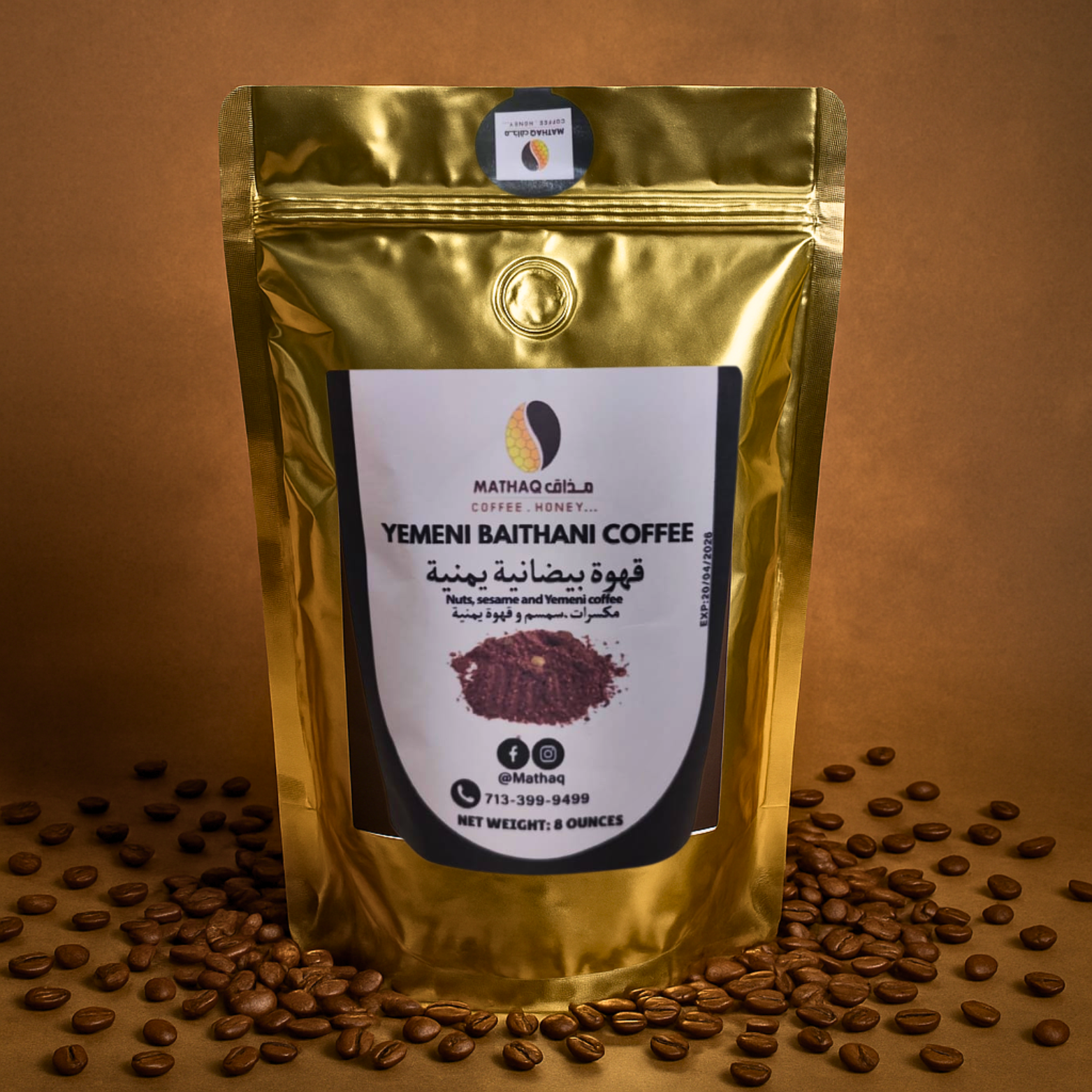 Yemen Baithani Coffee, a unique Yemeni blend of coffee, nuts, and sesame, delivering a rich, nutty flavor with an authentic traditional touch.